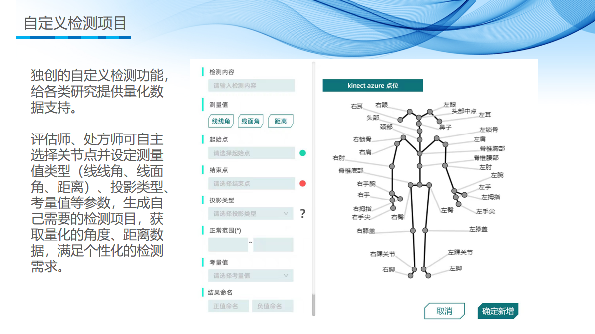 11.测评师、处方师可自主选择关节点并设定测量值类型 (线线角、线面角、距离)、 投影类型、考量值等参数,生成自己需要的检测项目,获取量化的角度、距离数据, 满足个性化的检测和研究需求。