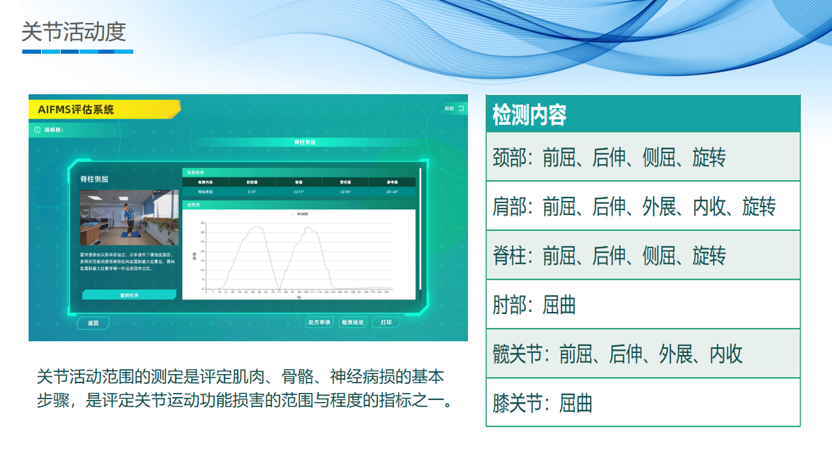 AIFMS检测体姿体态、关节活动度和动作模式后给出的定量、准确的数据,为医生、康复师、教练制定精准的运动处方提供准确、客观的依据。