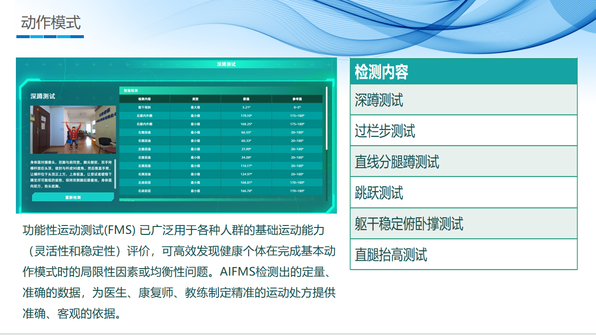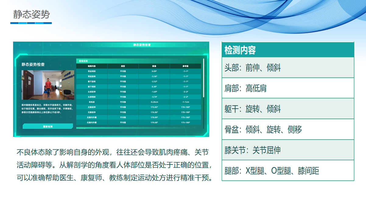 运用图像识别、深度学习等人工智能技术,开创性的实现功能性运动测试、体姿体态评估的定量、准确、便捷、低成本检测,并且检测结果具有高重复性,替代传统的主观评价模式。